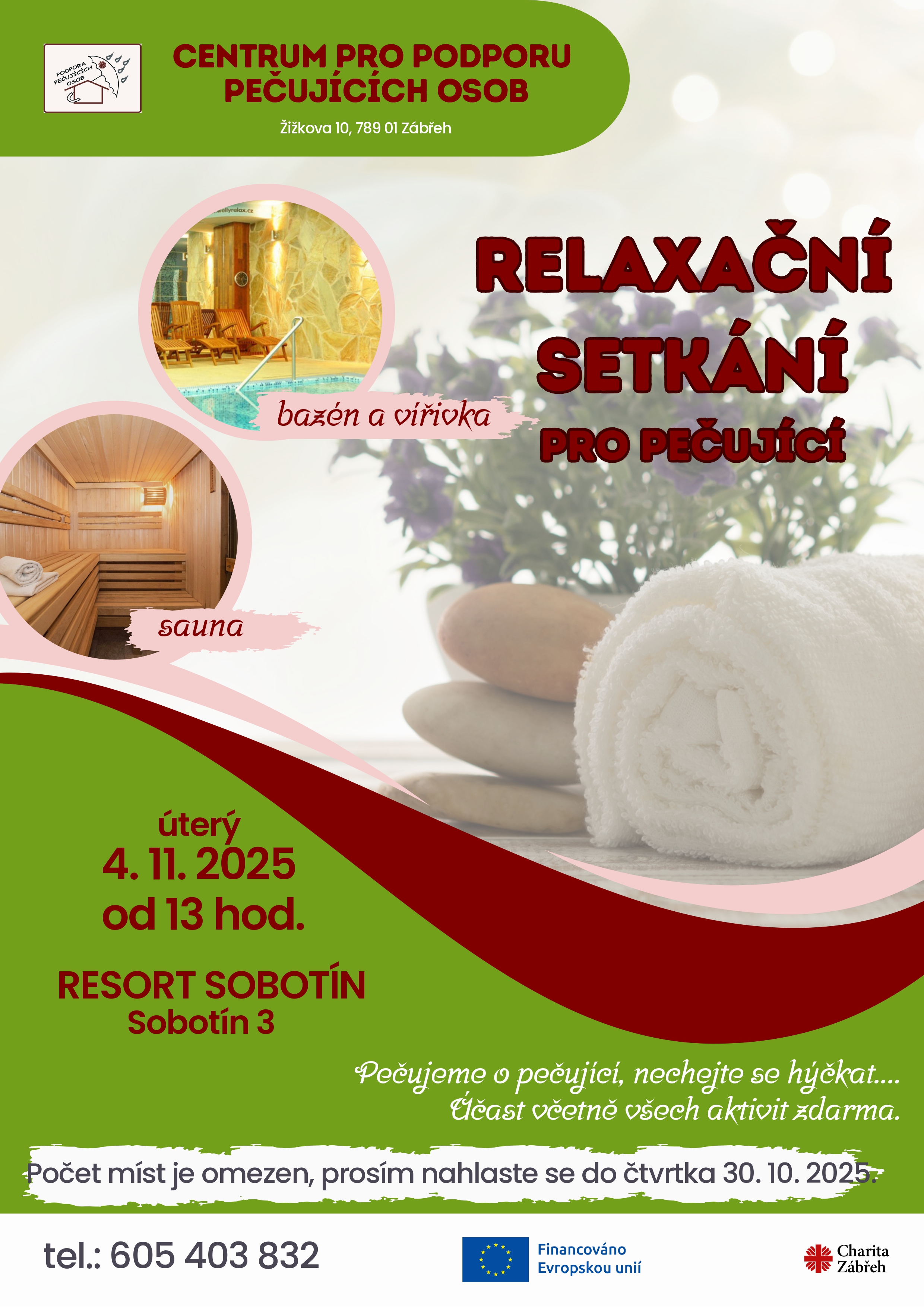Relaxační setkání v zázemí Wellness resortu Sobotín. Možnost relaxace a odpočinku pečujících v bazénu, vířivce a saunovém světě.