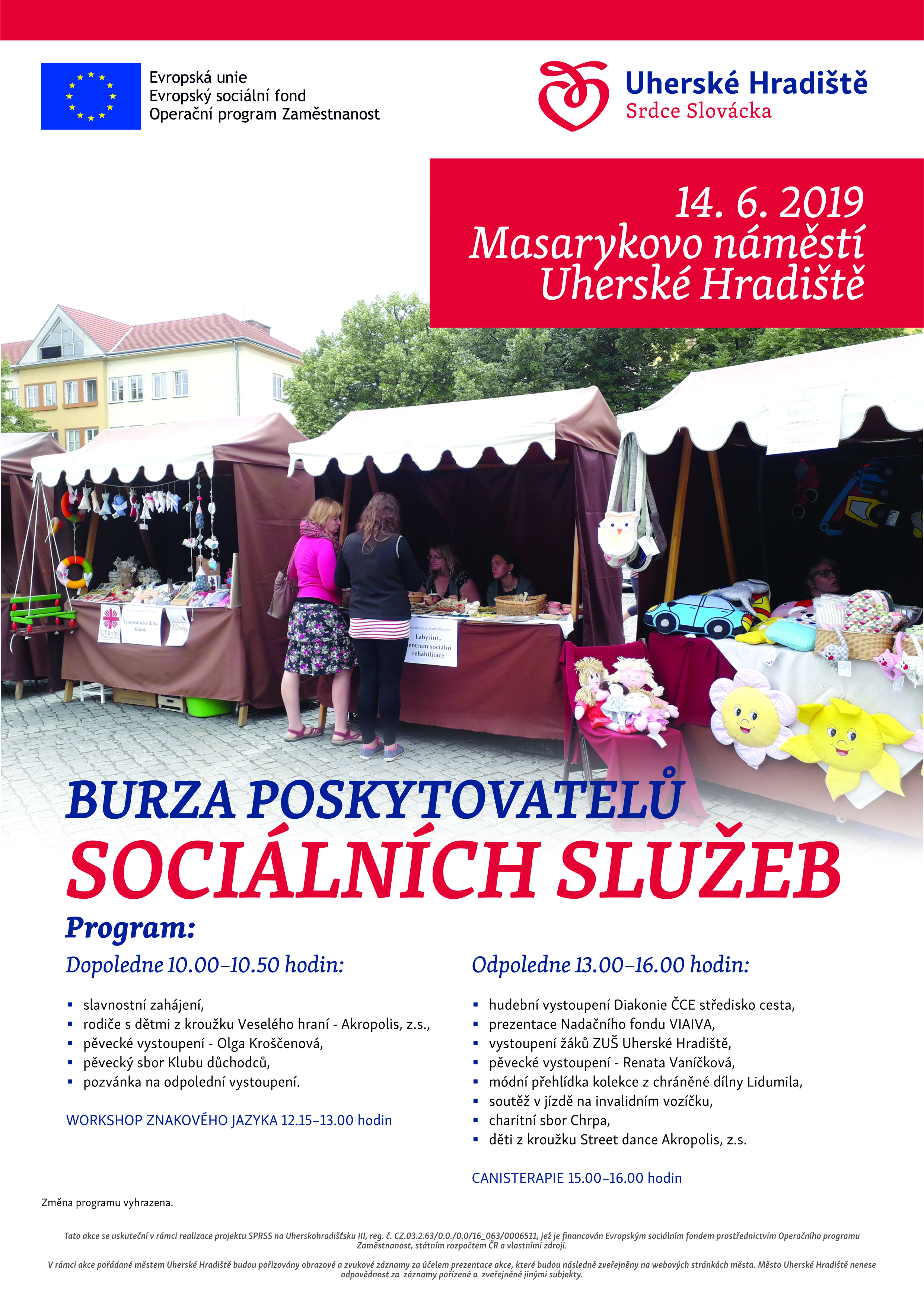 Dne 14.6.2019 na Masarykově náměstí v Uherském Hradišti se uskuteční další ročník Burzy poskytovatelů sociálních služeb, opět se bude jednat o celodenní akci, která je určena široké veřejnsoti. Hlavním cílem je především prezentace sociálních služeb působících v regionu Uherskohradišťska. Nabídky služeb budou prezentovány na velkoplošných panelech. Svou činnsot a výrobky svých klientů představí poskytovatelé sociálních služeb a chráněných dílen v dřevěných stáncích. Výrobky budou prodejné a výtěžek z prodeje poslouží pro rozvoj klientů jednotlivých zařízení. Součástí akce bude také prezentace kompenzačních pomůcek. Přítomní se budou moci aktivně zapojit do dílniček, jež budou svou činností zaměřeny na malé i velké účastníky. Akce bude doprovázena kulturním programem, na kterém se budou podílet i uživatelé sociálních slžueb. K vidění budou pěvecká vystoupení v různém podání, proběhne módní přehlídka ve spolupráci s chráněnou dílnou Lidumila, dále se můžete těšit na vystoupení dětí z kroužků organizace Akropoli a akci podpoří také žáci ZUŠ Uherské Hradiště.