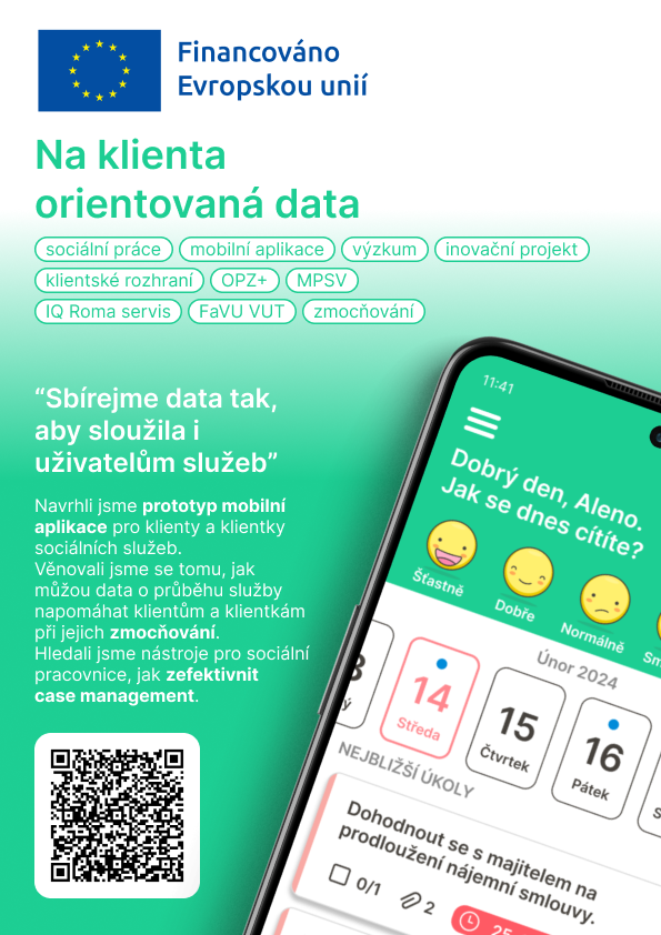 Projekt Na klienta orientovaná data se zaměřil především na problematiku neefektivního způsob záznamu informací o uživatelích sociálních služeb IQ Roma servis a jim poskytovaných službách. V rámci designového procesu došli k návrhu uživatelsky přívětivého digitálního nástroje, který usnadní práci sociálním pracovníkům a umožní klientům aktivnější zapojení. Vznikl prototyp mobilní aplikace s funkcemi jako je kalendář pro plánování schůzek, přístup k dokumentům, kontaktní informace a messaging. Aplikace má také klienty podpořit v samostatnosti – mohou si přidávat vlastní úkoly a sledovat svůj pokrok. Současně pak aplikace může sloužit jako nástroj pro sociální pracovníky pro zefektivnění case managementu.