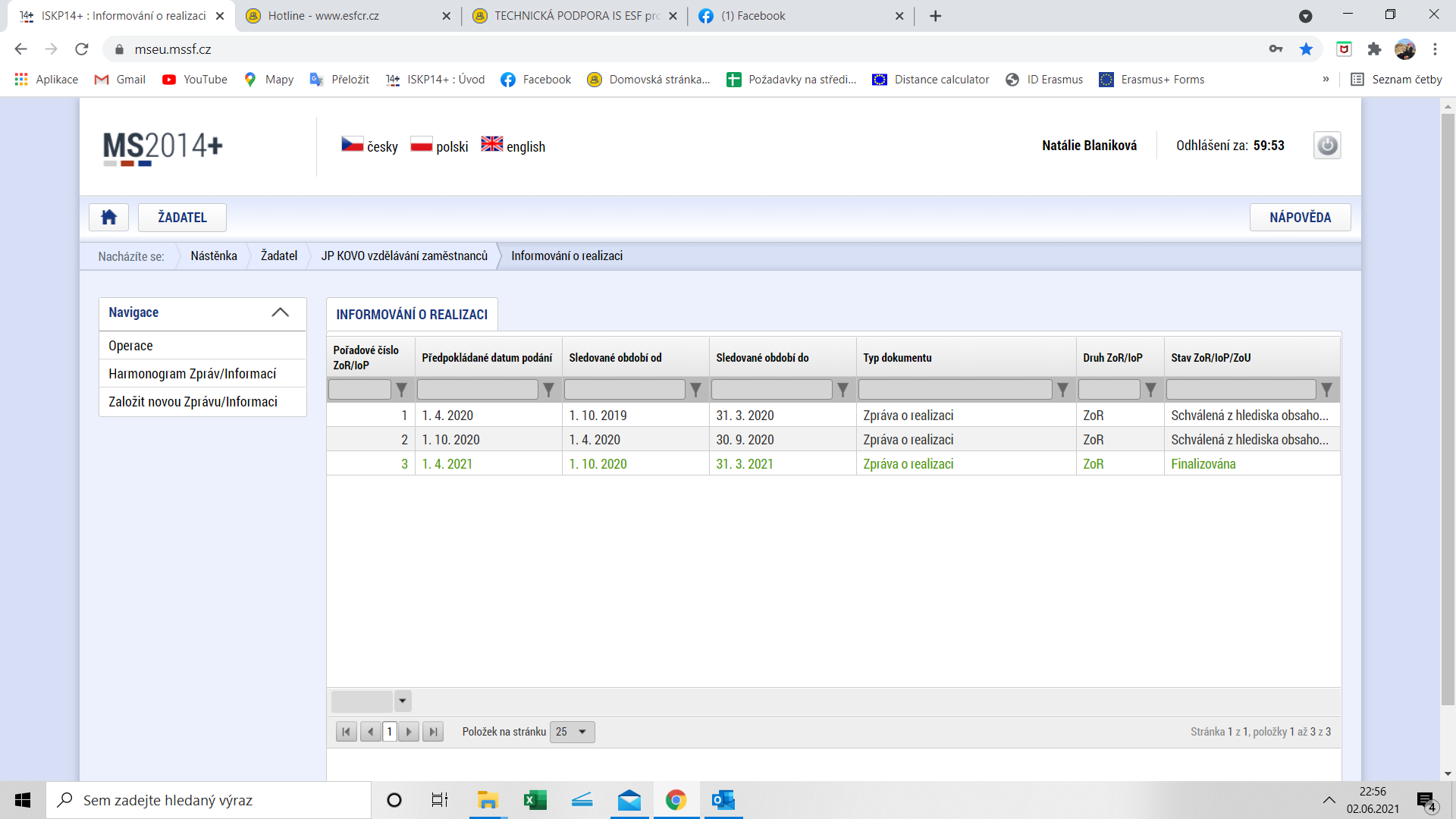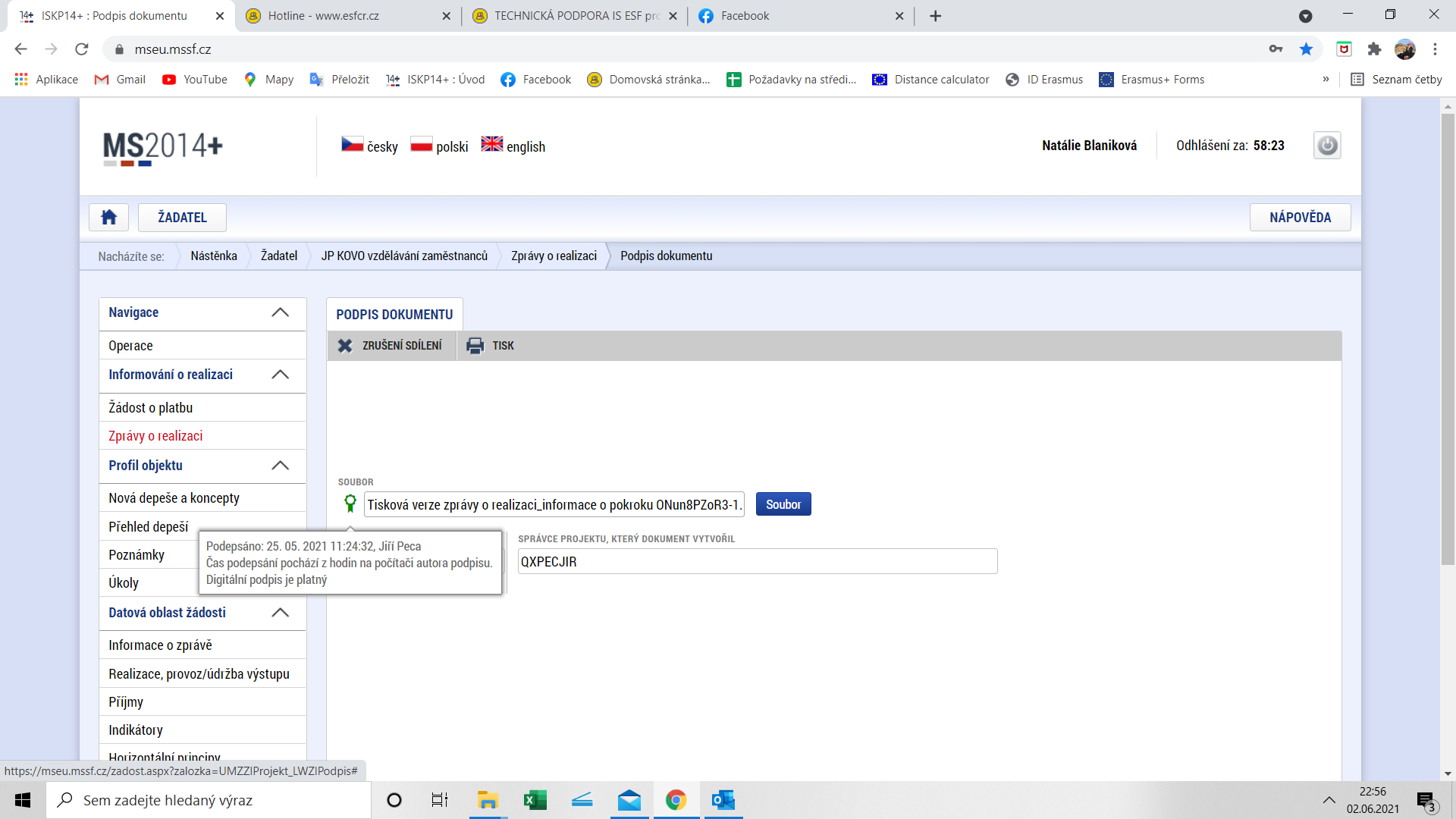 dne 25.5.2021 jsme elektronicky podepsali a podali zprávu o realizaci. Nicméně náš projektový manažer nás za pár dnů vyzval, že ZoR není podaná. Po kontrole, jsme zjistili, že ikdyž je podepsaná a měla být automaticky podaná, tak její stav se nezměnil a zůstala pořád jen Finalizovaná. I přesto, že je ve stavu finalizovaná, tak ji nelze zpřístupnit k editaci či zrušit finalizaci, aby se mohla podat znova.