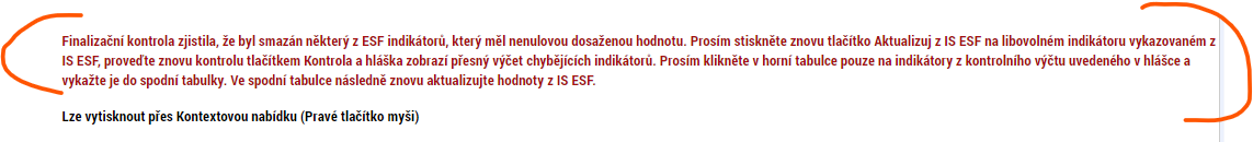 prosím ve zprávě o realizaci vyskočila hláška, že byl smazán nějaký indikátor. Neuvědomuji si, že jsem něco smazala, ale i tak jsem znovu celou zprávu smazala a založila novou a hláška zůstala. Indikátory nejdou obnovit přes doporučené tlačítko "aktualizuj z IS ESF", jelikož tam žádné není. Pravděpodobně tím, že nahrávání monitorovacích listů ještě nefunguje.