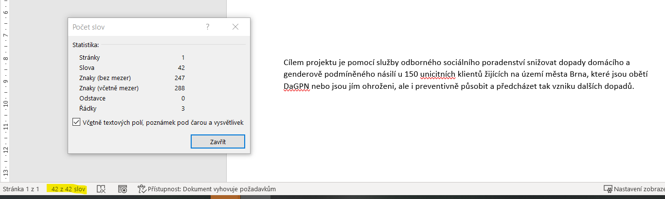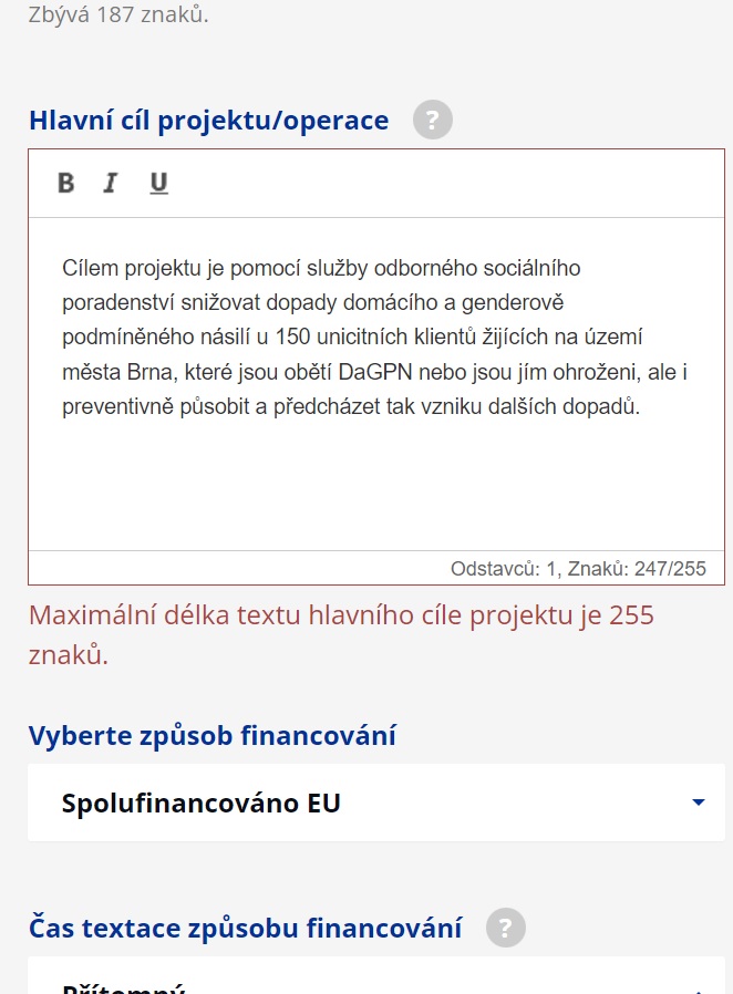 generátor povinné publicity zřejmě nefunguje správně, hlásí chybu, že "Maximální délka textu hlavního cíle projektu je 255 znaků", ale přitom mám v popisu 247 znaků.