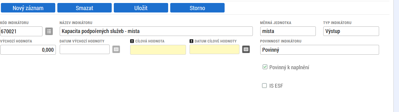 Nicméně cílová hodnota indikátoru může být nulová (nastavena na hodnotu 0) a požadované datum cílové hodnoty může být jakékoli datum v období realizace projektu (např. datum ukončení projektu).