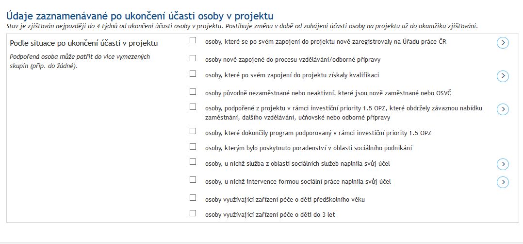 prosím o informaci, zda je nutné v IS ESF u všech účastníků projektu zaškrtnout některou z možností na záložce Charakteristiky účastníka v části Údaje zaznamenávané po ukončení účasti osoby v projektu. Můžeme zaškrtnout možnost, kterou daný účastník zvolil v monitorovacím listu, ale můj osobní názor je, že žádná z nabízených možností neodpovídá zaměření projektu ve výzvě č. 13, neboť zvolená varianta má "postihovat změnu v době od zahájení účasti osoby na projektu až do okamžiku zjišťování" a u většiny účastníků projektu k žádné změně nedošlo (např. byli zaměstnáni už před vstupem do projektu a jsou zaměstnáni i po ukončení své účasti v projektu).