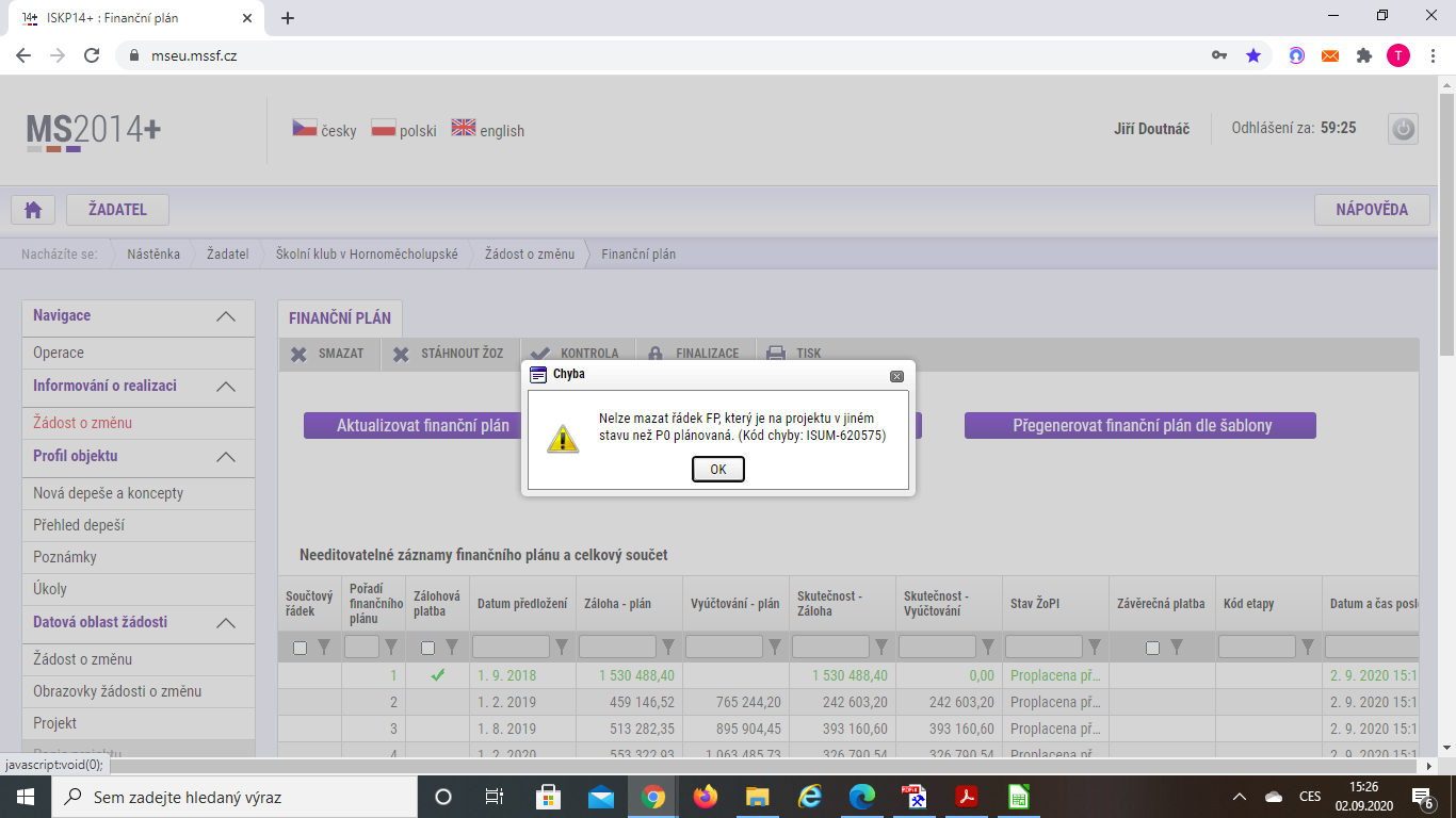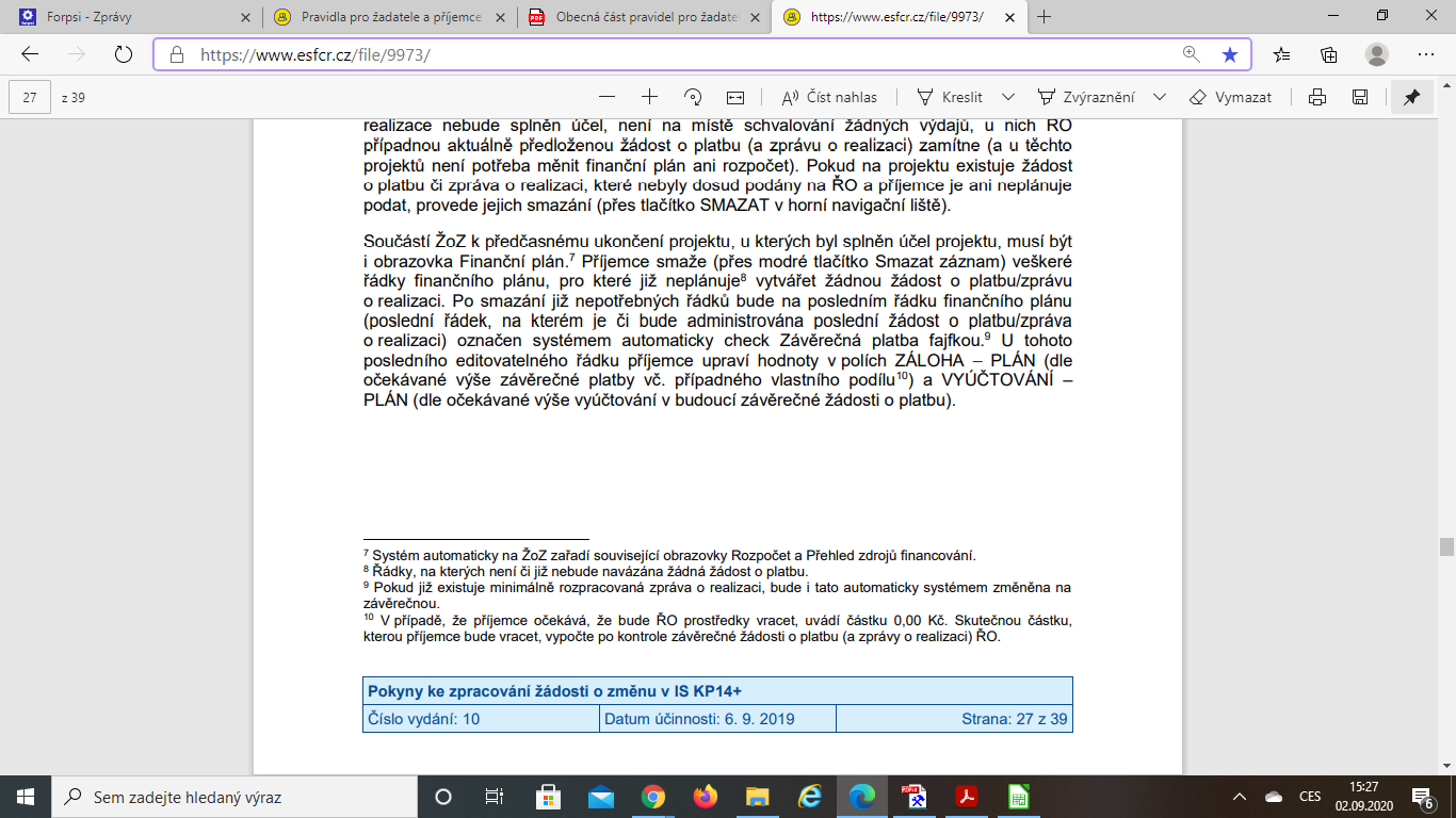 prosím o radu jak postupovat v případě, že škola chce projekt předčasně ukončit a v žádosti o změnu má upravit finanční plán. Při postupu dle metodiky "Pokyny k vyplnění ŽOZ" je uvedeno, že se mají vymazat všechny řádky určené pro monitorovací období, za které se nebude žádat žádost o platbu a ponechat jižjen řádek odpovídající závěrečné žádosti. Bohužel nyní je období, kdy již je "poslední aktuální" zpráva ŽOP založena, je tedy ve stavu rozpracovaná a nelze tudíž řádek jí odpovídající smazat ( lze pouze mazat stav plánovaná). Potřebujeme pouze proloužit monitorovací období o 3 měsíce a udělat ho současně závěrečným monitor. obdobím. Projekt již žádné výdaje od 30.6. nevykazuje, bylo by zbytečné psát 2 žádosti o platbu (k aktuálnímu období a závěrečné). Lze finanční plán ještě upravit a jak?