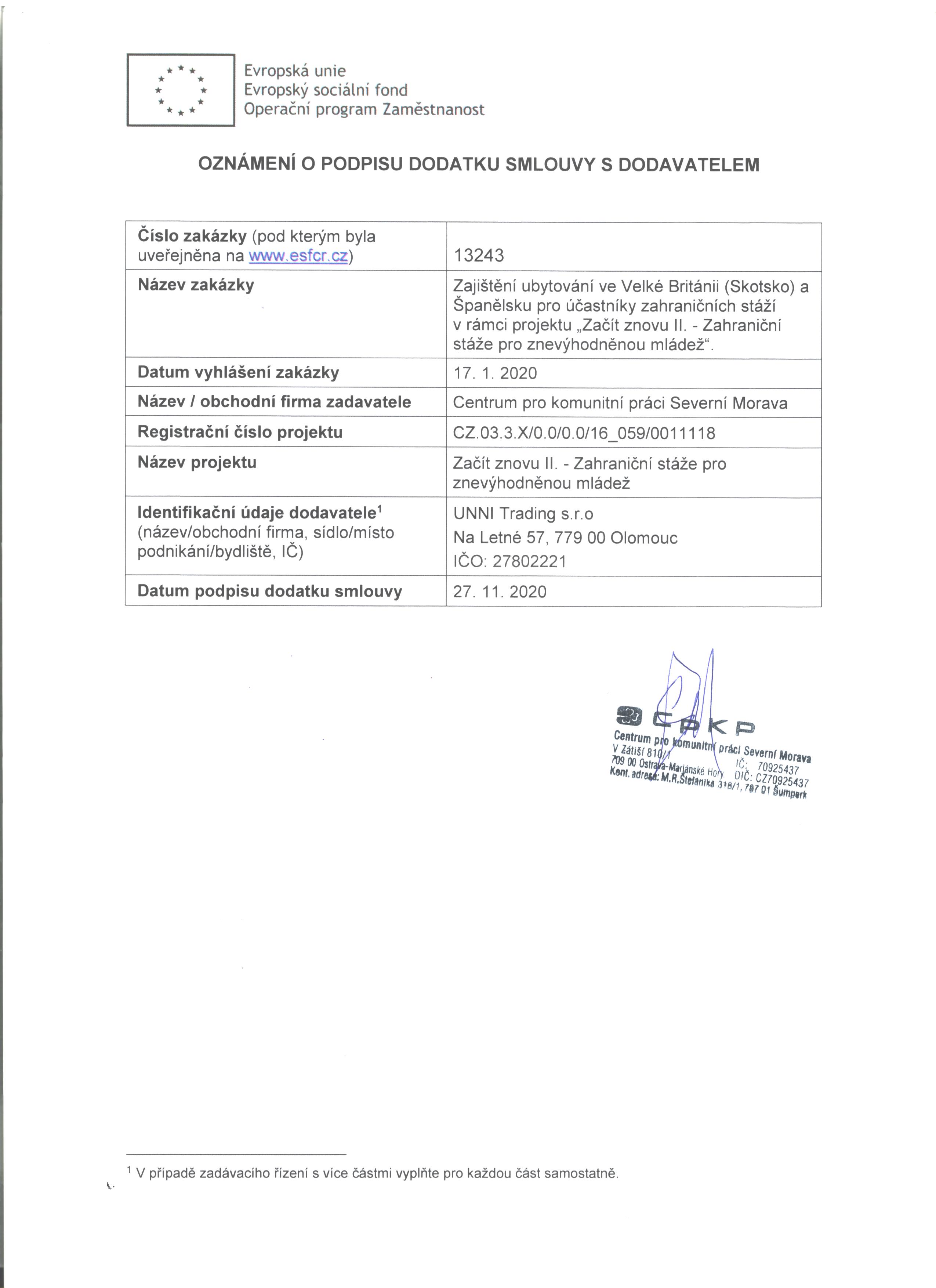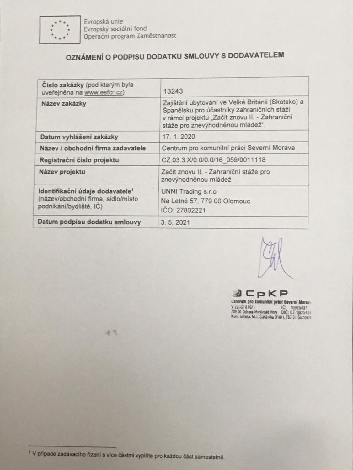 Zadavatel neposkytuje zálohové platby. Je však možno fakturovat dílčí plnění po ukončení prvního běhu v roce 2020. Datem plnění bude poslední den ubytování účastníků v příslušném běhu v roce 2020.Požadavek na písemnou formu nabídky: Uchazeč předkládá nabídku: V českém jazyce, vlastnoručně podepsanou osobou oprávněnou jednat za uchazeče, popř. zmocněncem, v řádně uzavřené obálce, opatřené na přelepu podpisem uchazeče, případně osoby oprávněné jednat za uchazeče.Ve dvou originálech v listinné podobě.Nabídka bude doručena poštou, kurýrní službou nebo osobně na adresu zadavatele: CpKP Severní Morava, M.R. Štefánika 1, 787 01 Šumperk.Nabídka musí být podána v uzavřené neporušené obálce, na které musí být uvedeny kontaktní údaje uchazeče, a musí být výrazně označena nápisem:NEOTVÍRAT - Zajištění ubytování ve Velké Británii (Skotsko) a Španělsku pro účastníky zahraničních stáží v rámci projektu „Začít znovu II. - Zahraniční stáže pro znevýhodněnou mládež“ s registračním číslem CZ.03.3.X/0.0/0.0/16_059/0011118.V případě nejasností může být uchazeč zadavatelem vyzván k vyjasnění nabídky ve stanovené lhůtě. Elektronické podání se nepřipouští.