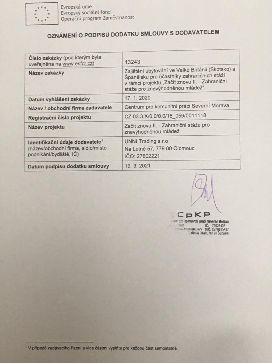 Místo pro podání nabídek: Nabídka musí být doručena na adresu zadavatele určené pro podání nabídek: Centrum pro komunitní práci Severní Morava, Regionální kancelář Šumperk - M. R. Štefánika 318/1, 787 01 Šumperk, 1. patro nebo osobně, a to v pracovní dny od 8:00 - 11:00. Místnost bude označena: Příjem nabídek na Zajištění ubytování ve Velké Británii (Skotsko) a Španělsku pro účastníky zahraničních stáží v rámci projektu „Začít znovu II. - Zahraniční stáže pro znevýhodněnou mládež“, kontaktní osoba Mgr. Ivo Škrabal.